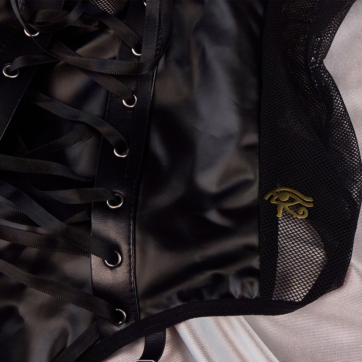 El sujetador con aro realza tu silueta, mientras los tirantes finos y los paneles de malla tejen un juego de misterio y piel, dejando solo lo esencial a la imaginación.